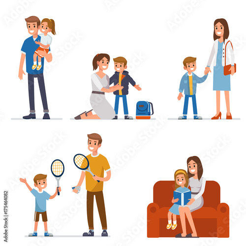 Healthy families concept with people scenes mega set in flat web design. Bundle of character situation with parents with kids shopping, training, playing, hiking, cycling. Vector illustrations.
