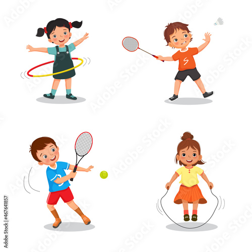 Children playing various sports activities, like hula hoop, badminton, tennis ball with racket, and jumping rope. Kids doing healthy physical exercises.