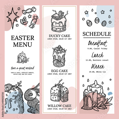 Rustic Easter Menu Template as vector image. Ready to Use Engraved style Illustration for Recipe Book, Delivery, Food. Kulich with Orange, Seed, Berry, Candle, Duck, Colored Egg with Pattern on Plate