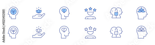 Stylized mental health line icons with clean minimalist design for psychological support, therapy, anxiety relief, brain care, and wellness-themed visuals