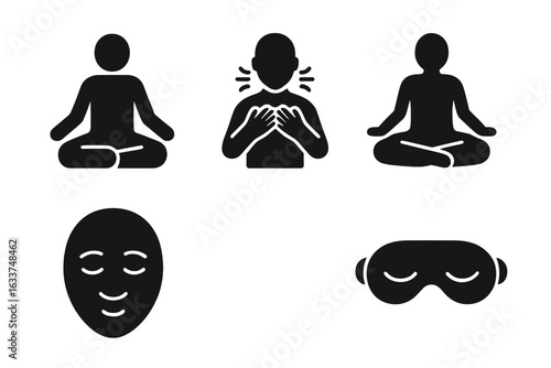 Mindfulness Meditation Yoga Icons Set. Flat Black Vector Symbols for Anxiety Relief, Deep Breathing, Relaxation, Lotus Pose, Calm Face, Sleep Mask, Stress Management, Mental Health, Wellness