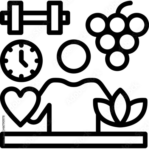 Wellness and Self-Care Line Icon Set – Vector Pictograms of Mental Clarity, Fitness, Nutrition, Relaxation, Meditation, Mental Health, Stress Relief, Body-Mind Connection, Thin Linear Illustration