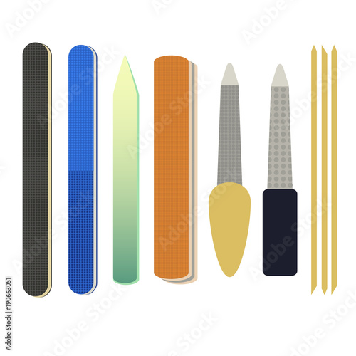 A collection set vector of manicure accessories - nail files, manicure tools, nail scissors, tweezers, nail polish, sticks. hand cream, brush. Illustration for manicure spa salons, body care.