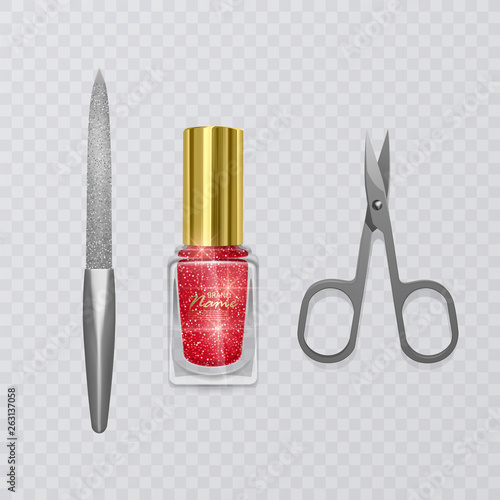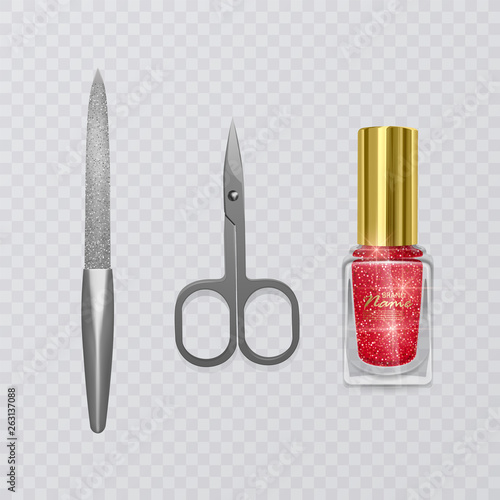 Set of manicure accessories, illustration of manicure scissors, red nail Polish and nail file, hand care, vector eps 10 illustration