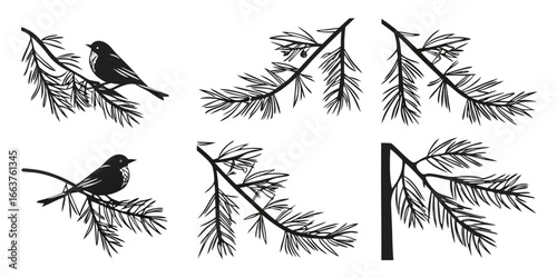 Illustration of a pine branch with needles and a pine cone in black silhouette on a white background