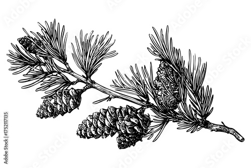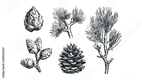 Pine Branch Sketch Isolated Botanical Illustration with Cones and Needles