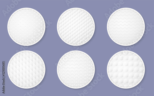 Set of realistic cotton pads with various textures - single round discs. 3d soft sponge with embossed surface. Essential cosmetic accessories for makeup removal, skincare routine mockup.