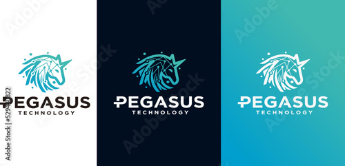 Pegasus technology horse logo icon design template. Pegasus technology logo in blue gradient color
