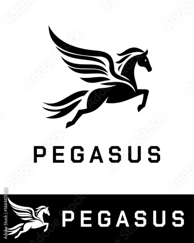 Elegant black Pegasus logo illustration featuring a winged horse in dynamic motion