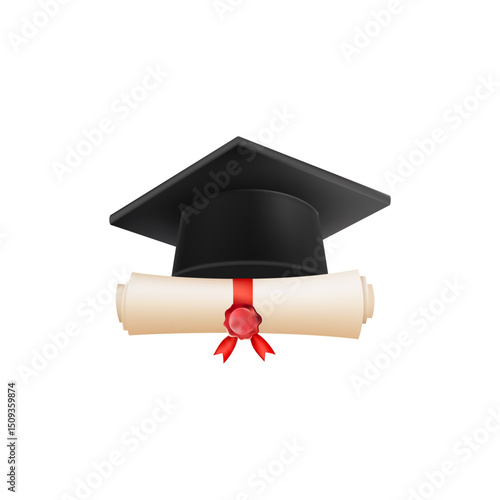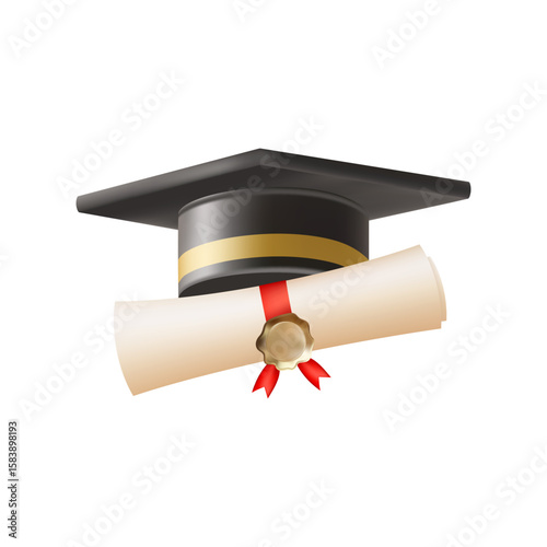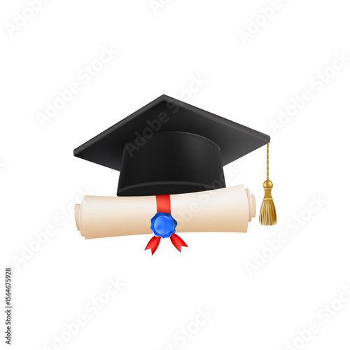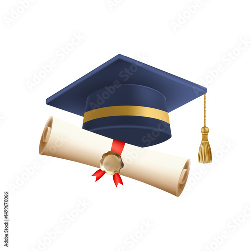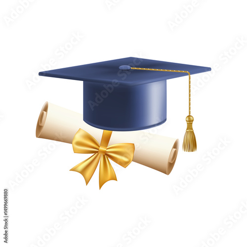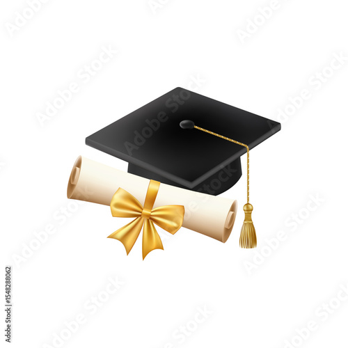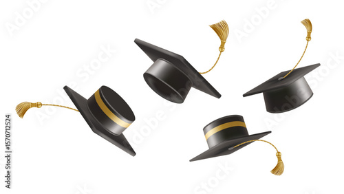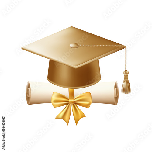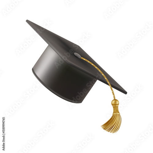 Realistic gold graduate cap. 3D Graduation Doctoral hat.
