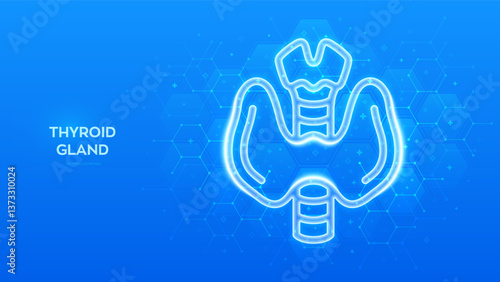 Thyroid gland icon. Thyroid health care. Awareness of Endocrine diseases hyperthyroidism, hypothyroidism. Endocrinology. Molecular structure. Blue medical background with hexagons. Vector illustration