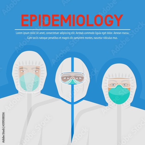 Internet poster with a team of doctors in protective suits, medical masks and glasses. Concept of the struggle of medical workers with the outbreak of the coronavirus epidemic COVID-2019.
