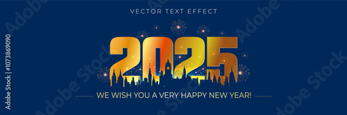 Happy New Year 2025. Decorated european city skyline, fireworks and celebration background. Vector illustration.