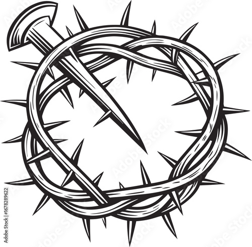 Black circular crown of thorns with sharp spikes and interwoven branches creates a symbolic image