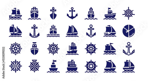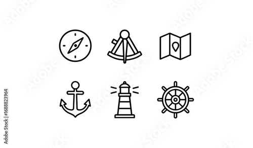 Set of nautical line icons with sailboat, anchor, lighthouse, and marine life symbols. Vector collection for sea travel and adventure themes