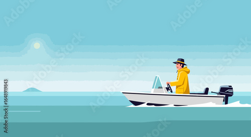 Sailor At The Helm Of A Ship On The Ocean Illustration Style And Flat Design Scene