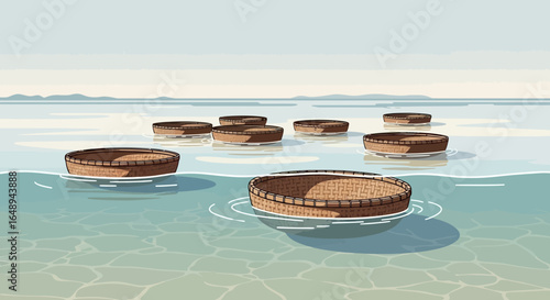 Silhouette of fishermen in boats rowing and with fishing nets