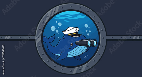 Stylized whale illustration within a circular compass design. Vintage nautical art featuring a majestic marine mammal, perfect for ocean adventure themes.