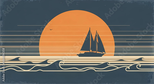 Dark blue sailboat against orange sunset and water, sailboat, yacht, sailing, boat, water, sea, ocean, waves, sunset, sunrise, orange, blue, dark blue, silhouette, graphic, illustration, vector, trave