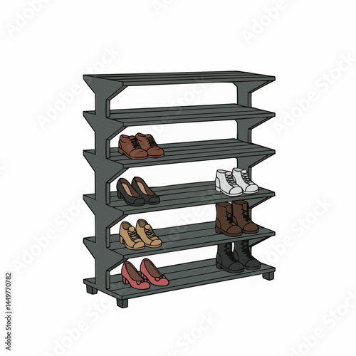 A high-angle, full shot depicts a stackable, clear plastic shoe storage unit containing various pairs of shoes.  The unit is composed of three tiers, each with multiple compartments displaying