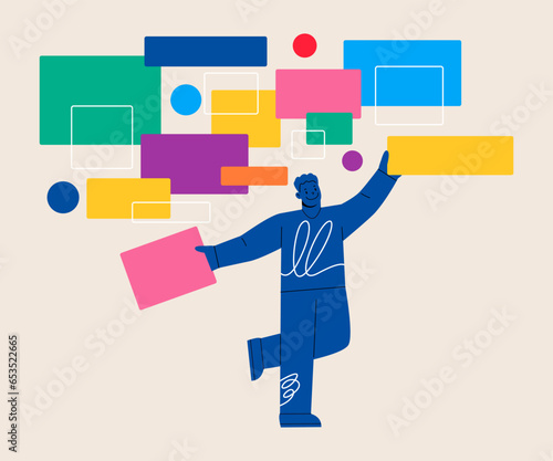 Designer building mobile application from abstract shapes for business. Ui ux design, app project development, coding concept with character working on big smartphone screen. Tools for wireframing.