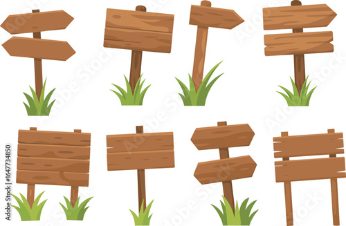 Realistic set of wooden sign posts. Vector illustration of blank square, round, rectangular signboards for pointing direction or name. Game ui design element