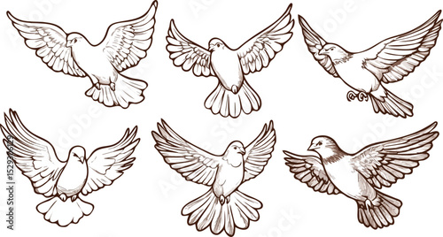 Dove bird hand drawn illustration in line art style isolated on white background. Flying dove with spread wings. Concept of love or peace