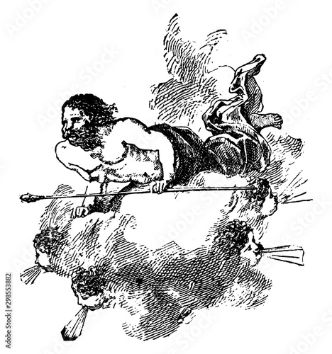Cute drawing of Cupid aiming his bow and shooting an arrow on a white background