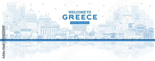 Wavy flag and ribbon of Greece three fold brochure modern design blue abstract background