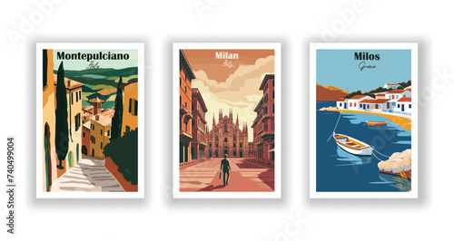 Milan, Italy. Milos, Greece. Montepulciano, Italy - Vintage travel poster. Vector illustration. High quality prints