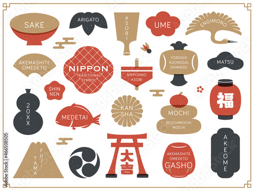 和モチーフのあしらいセット。水引や門松などのイラストやアイコンセット