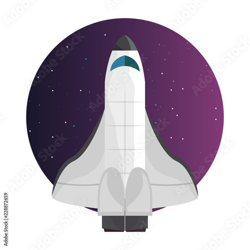 Cartoon space adventure poster. Rocket spaceship in galaxy. Vector design with shuttle explore galaxy with stars, planets, comets. Interstellar expedition in outer space, alien colonization mission