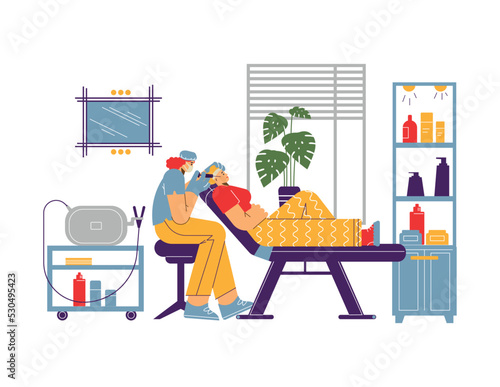Make up artist. Woman in a beauty spa getting a treatment. Facial treatments at the beauty salon vector illustration. Cosmetic massage. Face skin care. Spa therapy. Cosmetologist mesotherapy procedure