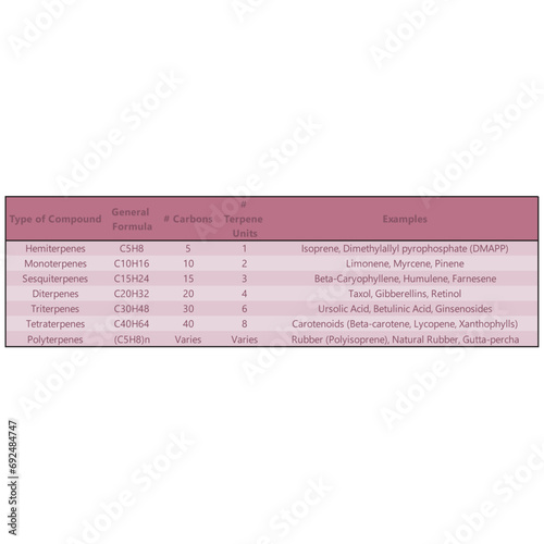 Table showing classification of Terpenes - general formula, number of carbons and isoprene units - Hemiterpenes, Monoterpenes, Triterpenes, Polyterpenes and more