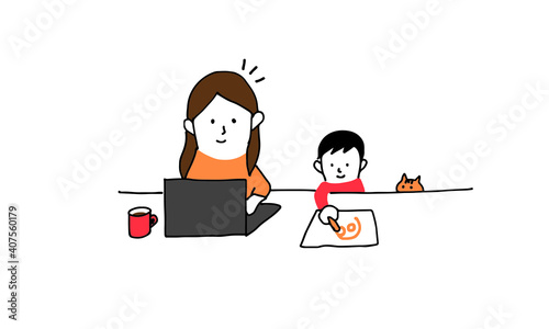 Vector of a mother with her infant baby, sitting at desk and working online on computer from home.
