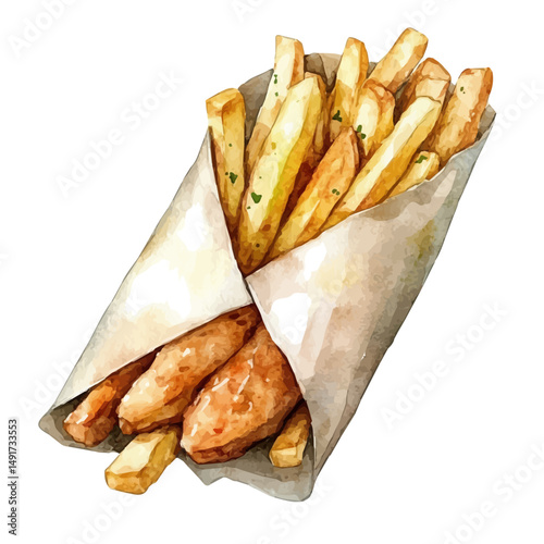 Hand drawn french fries with sauce and meat. Sketch Chicken wrapped in bacon. Chicken chunks rolled up with bacon