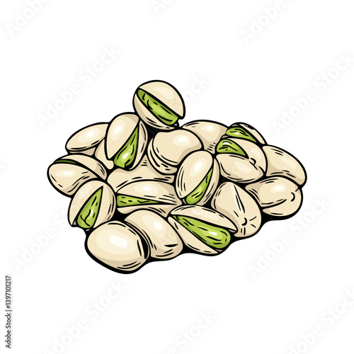 Pistachio nut illustration depicting a single shelled nut with a green kernel food item detailed drawing vector art