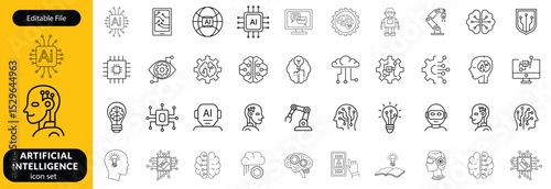 Digital Brain and Artificial Intelligence Icon Set. Human Brain and Electronic Circuitry Merging, Representing Machine Learning Technology Vector Outline Illustration.