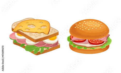 Sandwiches set. Hamburger and wheaten bread with various ingredients vector illustration