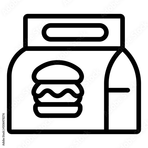 A simple line art drawing of a burger in a takeout box. The box has a handle on top. The burger is made of three layers two buns and a patty with wavy lines suggesting sauce. The drawing is in black