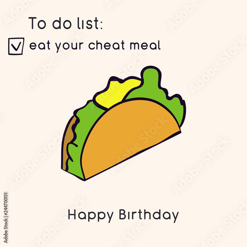 Doodle illustration of fast food. Junk food. Eat your cheat meal. Funny birthday card. Hand drawn vector illustration made in cartoon style.