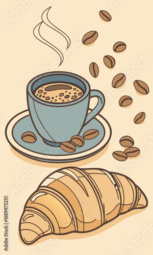 Breakfast tea and coffee sketch retro hand drawn cafe menu elements. Vintage dessert whimsical doodle drawing, Croissant and morning coffee mug, cappuccino beverage.
