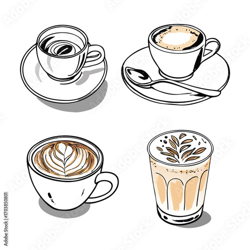 Collection of hand drawn coffee drinks and cups arranged in a row