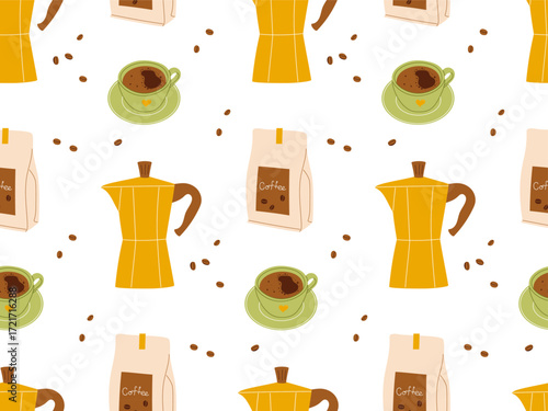 Black coffee cup seamless pattern hot beverage mug steam illustration cafe background morning drink art