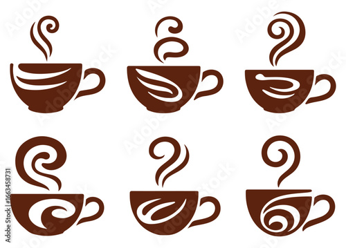 A stylish set of brown coffee cup icons with steam, representing different coffee drinks for a cafe's branding, vector illustration