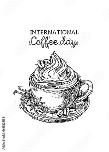 Stylish Black and White Coffee Cup Illustration with Latte Art Design