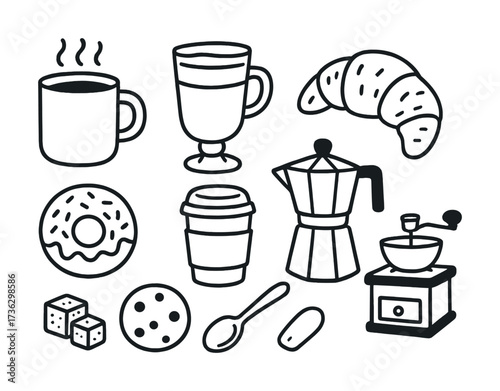 Coffee icons: espresso machine, cup, croissant, beans, mug, pitcher