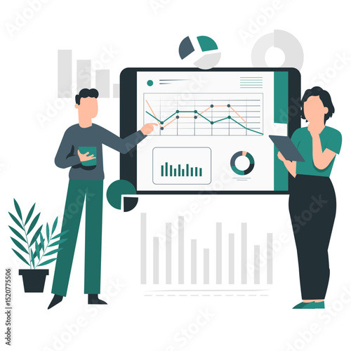 Flat vector Analyst reviewing multi-panel dashboard with bar charts and pie charts