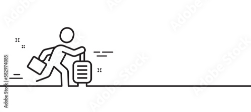 Baggage line icon. Man with travel luggage sign. Journey bag claim symbol. Minimal line illustration background. Baggage line icon pattern banner. White web template concept. Vector