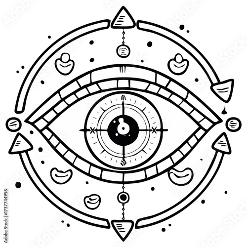 Line art illustration of mystical objects on white background